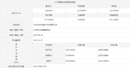 据标的企业近期财务表分析,截至今年7月底,该企业营业收入为0,净利润亏损22.93万元,资产总额707.23万元,负债总额5.90万元。另据山东东洲永信资产评估有限公司评估,标的企业净资产为1003.74万元,而资产和负债总计未显示,企业回复为“业务无法提供”。