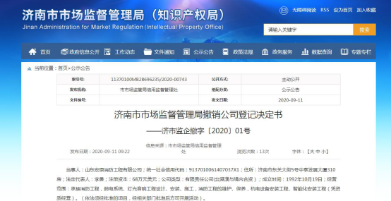 今日,济南市市场监督管理局(以下简称“济南市市监局”)发布公告称,经调查,山东宏原消防工程有限公司(以下简称“宏原消防”)因提交虚假材料隐瞒真实情况取得公司登记,情节严重,被济南市市监局撤销公司2012年9月20日变更登记、2017年5月9日备案登记、2017年5月25日变更登记、2019年7月18日变更登记。并要求宏原消防收到本决定书之日起十日内,将营业执照正本、副本全部交回济南市市监局。逾期未交回,将予以公告作废。