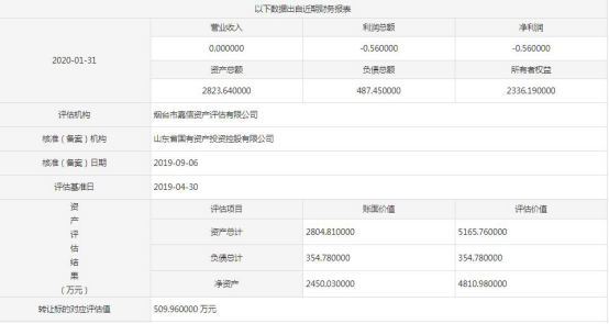 另据烟台市嘉信资产评估有限公司评估,该企业资产总计5165.76万元,负债总计354.78万元,净资产4810.98万元,推算转让标的对应值为509.96万元。