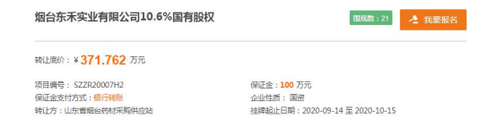 今日,山东省烟台药材采购供应站再度在山东产权交易中心发布公告,将以371.76万元价格转让烟台东禾实业有限公司(以下简称“东禾实业”)10.6%国有股权,值得注意的是,这已经是山东省烟台药材采购供应站今年第四次转让标的企业股权,转让价更是逐次降低。