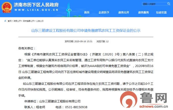 济南市历下区人民政府网站发布的上述公示文件显示,根据《济南市建筑农民工工资保证金管理办法》(济建发〔2020〕3号)第八条第(二)项之规定:“施工单位能够认真落实农民工实名制管理、通过工资专用账户以银行代发形式直接向农民工支付工资等制度,根据全市建筑市场信用评价结果,被评为AAA级的可申请免缴工资保金”,2020年9月16日 山东三箭建设工程有限公司向历下区住房和城市建设局提交明湖壹品苑项目免缴建筑农民工工资保证金的申请。