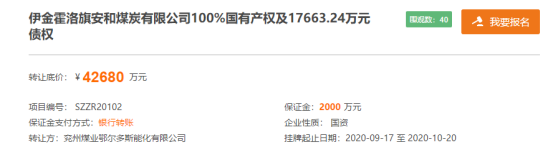近日,鲁网·泰山财经记者在山东产权交易中心获悉,兖州煤业二次挂牌转让旗下一全资公司——伊金霍洛旗安和煤炭有限公司(以下简称“安和煤炭”)100%国有产权及1.7663亿元债权。转让底价为4.268亿元,挂牌时间从9月17日到10月20日。本次转让将会导致安和煤业的实际控制权发生转移。
