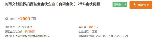 济南市股权投资母基金有限公司在山东产权交易中心发布公告称,将以2500万元转让济南文创股权投资基金合伙企业(有限合伙)25%合伙份额,转让时间为2020年9月18日至10月21日。