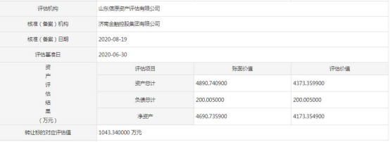 另据山东信原资产评估有限公司评估,标的企业资产总计4373.36万元,负债总计200.01万元,净资产4173.35万元,因此推算评估值为1043.34万元。