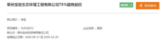 今日,莱州金宏投资有限责任公司(以下简称“金宏投资”)在山东产权交易中心发布公告称,将转让子公司莱州宝地生态环境工程有限公司 (以下简称“宝地生态”) 75%国有股权,目前处于信息预披露阶段,转让时间为2020年9月17日至10月20日。