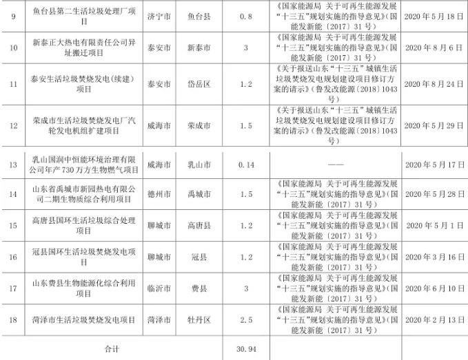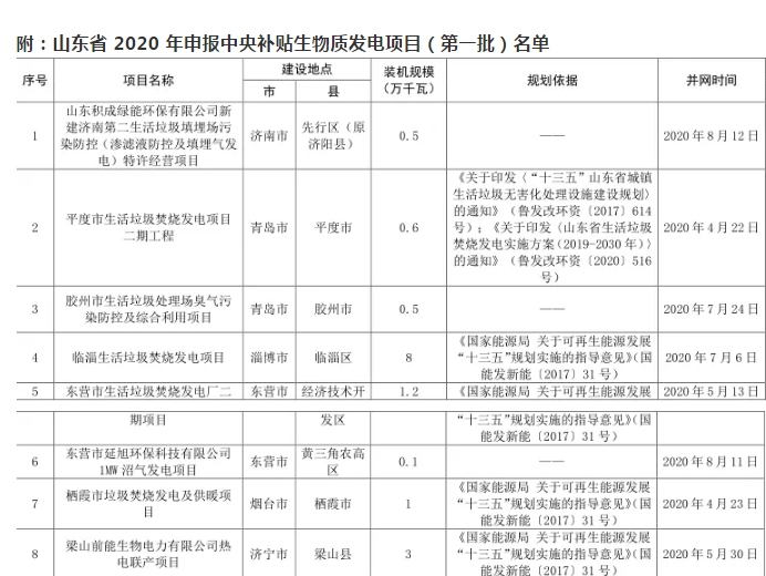 鲁网·泰山财经记者自山东省能源局获悉,山东省2020年申报中央补贴生物质发电项目(第一批)名单已“出炉”。据山东省能源局公告显示,本次共有18个项目入选。 此次项目申报活动是山东省能源局按照国家发展改革委、财政部、国家能源局联合下发《关于印发<完善生物质发电项目建设运行的实施方案>的通知》(发改能源〔2020〕1421号)要求,在企业申报、各市发展改革委(能源局)初审的基础上,梳理汇总了2020年第一批申报中央补贴生物质发电项目(2020年1月20日-8月底全部机组并网),项目申报有关情况公示如下。本次项目申报公示时间:为020年9月23日至2020年9月25日(3个工作日)。山东省能源局公示期内,对有关项目情况有异议的,可及时向省能源局新能源处反映,并提供加盖单位公章或签署实名和联系方式的反映材料。联系电话:0531-68627613,地址:济南市市中区旅游路28666号,邮政编码:250014