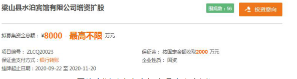22日,鲁网·泰山财经记者在山东产权交易中心获悉,梁山县人民政府招待所旗下梁山县水泊宾馆有限公司(以下简称“水泊宾馆”)拟通过增资扩股的方式,进行混合所有制改革。本次水泊宾馆欲征集意向投资方1名,募集资金总额不低于8000万元,对应持股比例为55.6%。目前,梁山县政府招待所持有该公司100%股权。