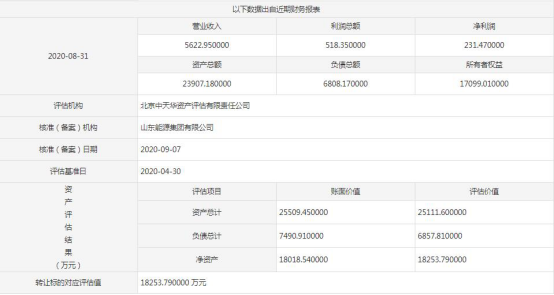 另据财务数据得知,截至今年8月底,标的企业营收5622.95万元,净利润231.47万元,资产总额2.39亿元,负债总计6808.17万元。另据北京中天华资产评估有限责任公司评估,标的企业资产总计2.51亿元,负债总计6857.81万元,净资产1.83亿元,推算转让值为1.83亿元。