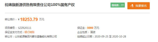 近日,山东能源集团内蒙古盛鲁能化有限公司(以下简称“盛鲁能化”)在山东产权交易中心发布公告称,将以1.83亿转让杭锦旗新源供热有限责任公司(以下简称“新源供热”)100%国有产权,转让时间为9月25日至10月28日。