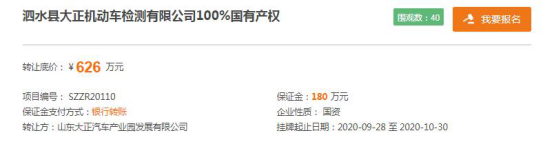 山东大正汽车产业园发展有限公司(以下简称“大正汽车”)今日在山东产权交易中心发布公告称,拟转让旗下泗水县大正机动车检测有限公司100%国有产权,转让底价为626万,挂牌时间为9月28日至10月30日。
