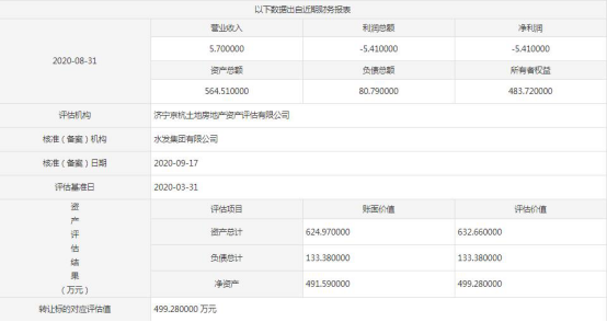 根据标的企业财务数据图分析,截至今年8月底,标的企业营收达5.70万元,净利润亏损5.41万元,资产总额564.51万元,负债总计80.79元。另据济宁京杭土地房地产资产评估有限公司评估,标的企业资产总计632.66万元,负债总计133.38万元,净资产499.28万元,推算转让评估值499.28万元。