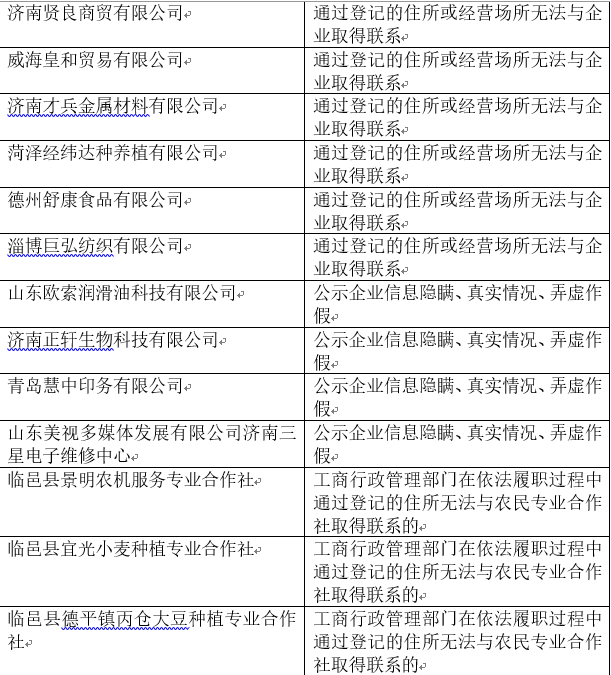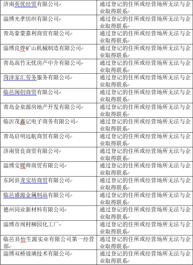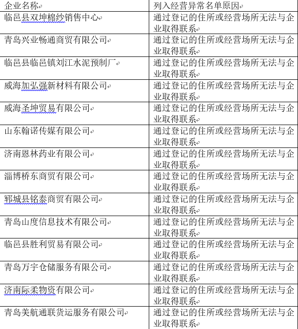 公告显示,这50家企业于2017年12月5日因"通过登记的住所或经营场所无法与企业取得联系"和"公示企业信息隐瞒真实情况、弄虚作假的"等原因被列入经营异常名录,并将于2020年12月5日届满三年。根据《企业信息公示暂行条例》第十七条第二款的规定,被列入经营异常名录届满3年仍未履行相关义务的由工商行政管理部门列入严重违法失信企业名单,并通过国家企业信用信息公示系统向社会公示。省市监局要求有关企业尽快履行相关义务,并向工商部门申请移出经营异常名录。