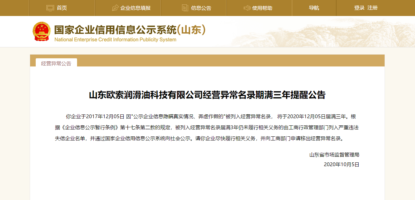 近日,山东省市场监督管理局(以下简称“省市监局”)连发50条公告,提醒山东欧索润滑油科技有限公司等50家企业已被列入经营异常名录期满三年,如再不履行相关义务,将被工商行政管理部门列入严重违法失信企业名单。