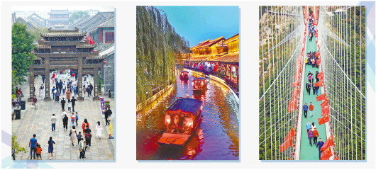 左:10月1日,游客在无棣县古城景区观光。中:10月2日,游客乘船在台儿庄古城景区夜游。右:10月5日,游客在沂蒙山银座天蒙旅游区游览。(初宝瑞 高启民 武纪全摄)