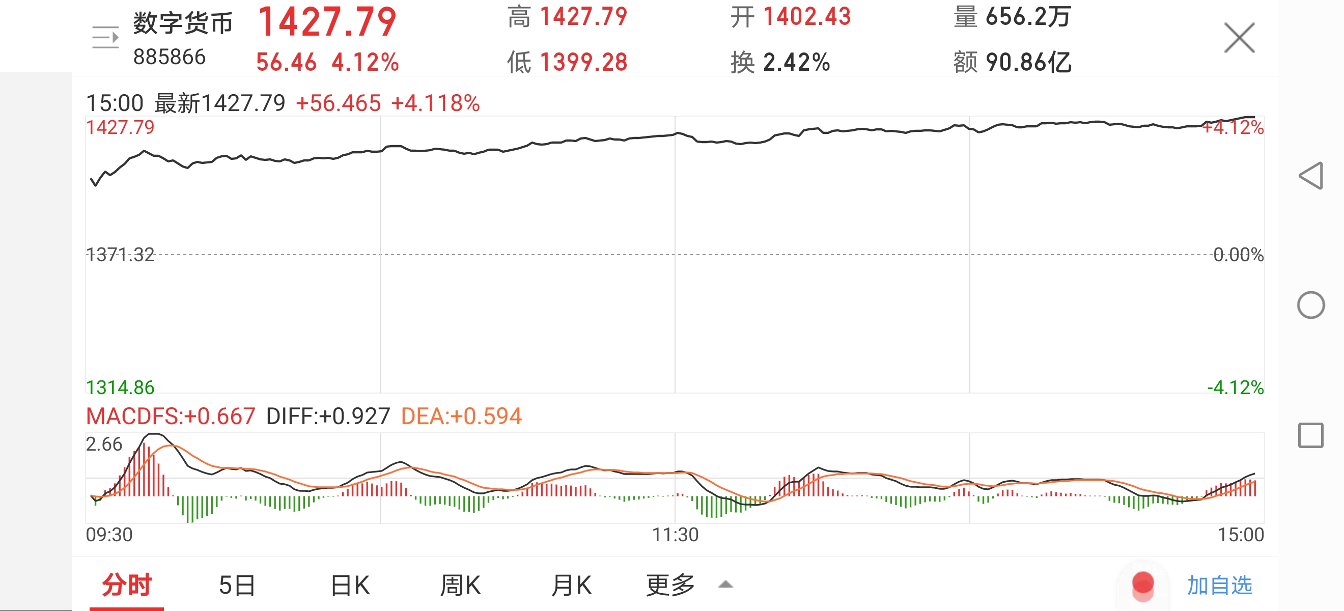 值得注意的是,随着深圳“红包雨”的出台,数字货币板块也应声走高。10月9日,数字货币板块以1402.43元/每股“热火”高开,收盘时涨至1427.79元/每股,换手率2.42%,该板块涨逾4%。更有网友在同花顺平台表示,“涨停再多来几个”。