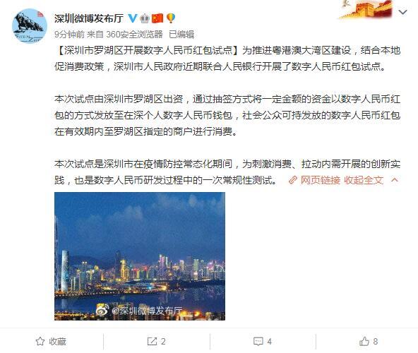 10月8日,深圳市互联网信息办公室官方微博“深圳微博发布厅”发布公告称,为推进粤港澳大湾区建设,结合本地促消费政策,深圳市人民政府近期联合人民银行开展了数字人民币红包试点。值得注意的是,本次活动金额共计1000万元,可在深圳市罗湖区辖内已完成数字人民币系统改造的3389家商户无门槛消费。此番深圳大秀“宠爱”迅速引发了人们对数字货币的热议。