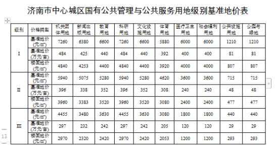 鲁网•泰山财经记者从新版的基准地价表看到,济南城区商服用地被分为9个级别,其中一、二、三级基准地价分别为每平方米11924元、10942元、8198元,九级为每平方米1620元;而按此前的基准地价,一、二、三级商业用地分别为每平方米8510元、7127元和5203元,九级为878元/平方米。若仅拿极值对比,本次城区商业用地基准地价的调整幅度在1/3以上。