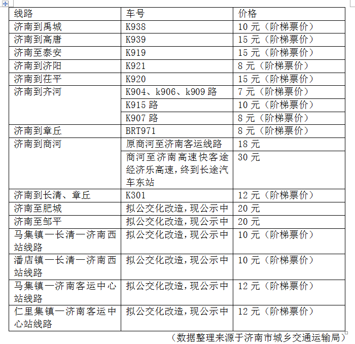 据济南市城乡交通运输局数据显示,目前已开通济南到周边城际公交线路城际公交线路含济禹公交在内共14条,包括济南到禹城K938,济南到高唐K939,济南至泰安K919,济南到济阳K921,济南到茌平K920,济南到齐河K904、k906、k909、K915、K907,济南到章丘BRT971,济南到商河客运线路、高速快客,济南到长清、章丘K301,票价在8元-30元不等,除商河外,均执行阶梯票价。