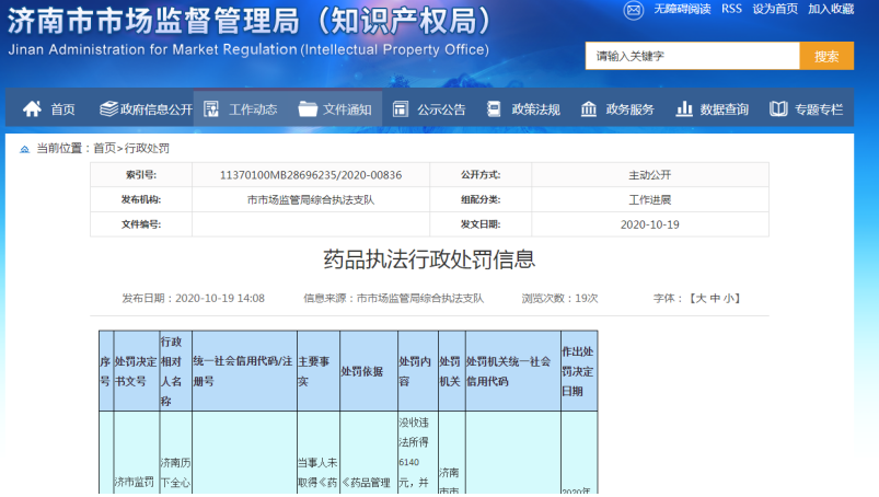 据《药品管理法》(2015年修正)第七十二条规定,未取得《药品生产许可证》、《药品经营许可证》或者《医疗机构制剂许可证》生产药品、经营药品的,依法予以取缔,没收违法生产、销售的药品和违法所得,并处违法生产、销售的药品(包括已售出的和未售出的药品,下同)货值金额二倍以上五倍以下的罚款;如构成犯罪的,将依法追究刑事责任。而在“济市监罚字〔2020〕0703号”公告中提到,济南历下全心全颐商贸中心正是违反了该规定,因此济南市市监局对该企业做出依法没收违法所得6140元,并处罚款12280元,的处罚。处罚日期为2020年10月14日。