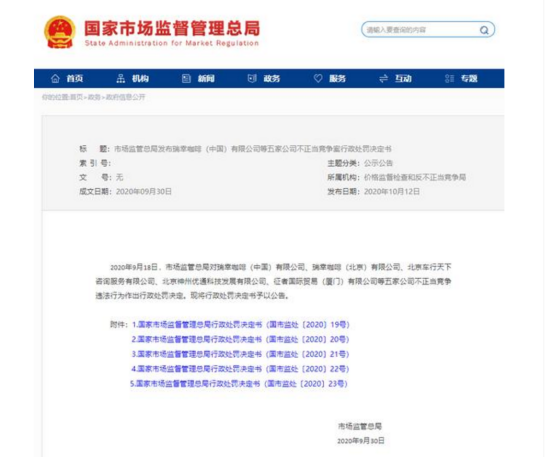 据国家市场监管总局网站显示,2020年9月18日,市场监管总局对瑞幸咖啡(中国)有限公司、瑞幸咖啡(北京)有限公司分别罚款人民币200万元,共计400万元。