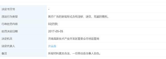 2017年,半亩花田因因医疗广告的表现形式含有淫秽、迷信、荒诞的情形,再次被予以行政处罚。