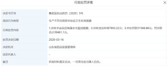 而在今年3月,半亩花田就曾因同款产品被山东省药品监督管理局行政处罚。鲁药监执法药罚【2020】5号的文件显示,半亩花田被处罚主要原因是违反了《化妆品卫生监督条例》第十一条的规定,即“生产企业在化妆品投放市场前,必须按照国家《化妆品卫生标准》对产品进行卫生质量检验,对质量合格的产品应当附有合格标记,未经检验或者不符合卫生标准的产品不得出厂”。这也就意味着,半亩花田该面膜产品在进入市场前也许并未进行相应检测。最终,半亩花田因生产不符合国家化妆品卫生标准面膜,被没收违法所得7892.22元;并处罚款31568.88元,罚没款合计39461.1元。不合格产品半亩花田海藻水光盈润面膜也被依法没收。