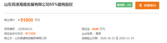近日,山东高速物资集团有限公司(简称“高速物资集团”) 在山东产权交易中心发布公告称,拟以9.18亿底价,转让旗下山东高速海南发展有限公司(简称“高速海南发展公司”)85%国有股权。据公开信息,早在2015年,高速物流集团就曾挂牌转让高速海南发展公司15%股权,随后又接连3次披露转让信息,如今已是第4次转让了。