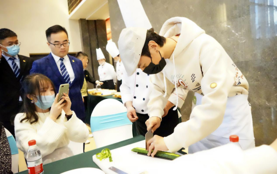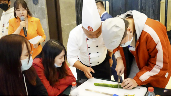 随后,学生们被分成了四组,在大厨们的指导下进行了一场技能比拼。山东大学的大三学生欧勇楷,从香港来到山东求学,两年时间已经渐渐习惯了北方人的饮食口味,虽然有一点做饭功底,但他直言切黄瓜的过程非常“紧张刺激”,“每一次切下去的时候,都以为要断了,体验过之后,才深刻领会到了鲁菜中的工匠精神。”
