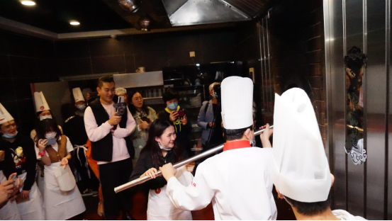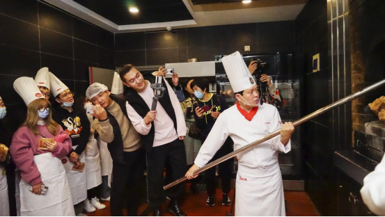 “第一次吃,味道很香!”学生们正吃得津津有味,又被引到了济南烤鸭的制作现场,讲解人张师傅是济南烤鸭技艺的第四代传承人。“每只鸭子重4.5斤左右,排酸至少36小时,风干至少6小时,进炉烤制70分钟”,每只烤鸭的制作流程都十分讲究。随后,学生们在烤鸭房,观看了鸭子的烤制过程,来自香港的学生黄春雅更是自告奋勇进行了一番体验,在张师傅的指导下尝试操作烤杆调整鸭子的位置,她感慨说:“靠近烤炉的时候就觉得好热,烤杆又长又重,操作看着简单却很吃力,做烤鸭的师傅们真的很辛苦。”