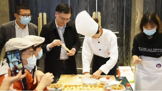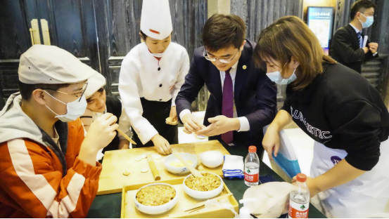 学生们在体验的同时,同行的老师和嘉宾也都没有闲着。香港特区政府驻山东联络处副主任方明远在一旁看得饶有兴致,甚至会走上前一起参与制作过程,“这个机会很难得,学生们在了解鲁菜文化的同时,能学习到实用的技能,相信他们会把今天所学所感分享给身边的亲朋好友。”
