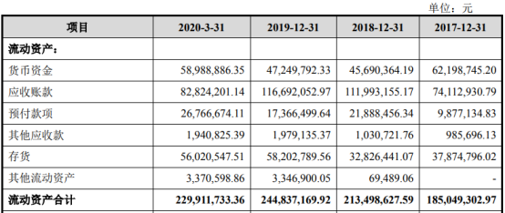 另外,应收账款和存货也在不断攀升。2017-2019年,公司应收账款分别为0.74亿元、1.12亿元、1.17亿元,今年第一季度为0.83亿元。2017-2019年,公司存货分别为0.38亿元、0.33亿元、0.58亿元,今年第一季度为0.56亿元。按今年一季度计算,应收账款和存货在流动资产中占比约60.43%。