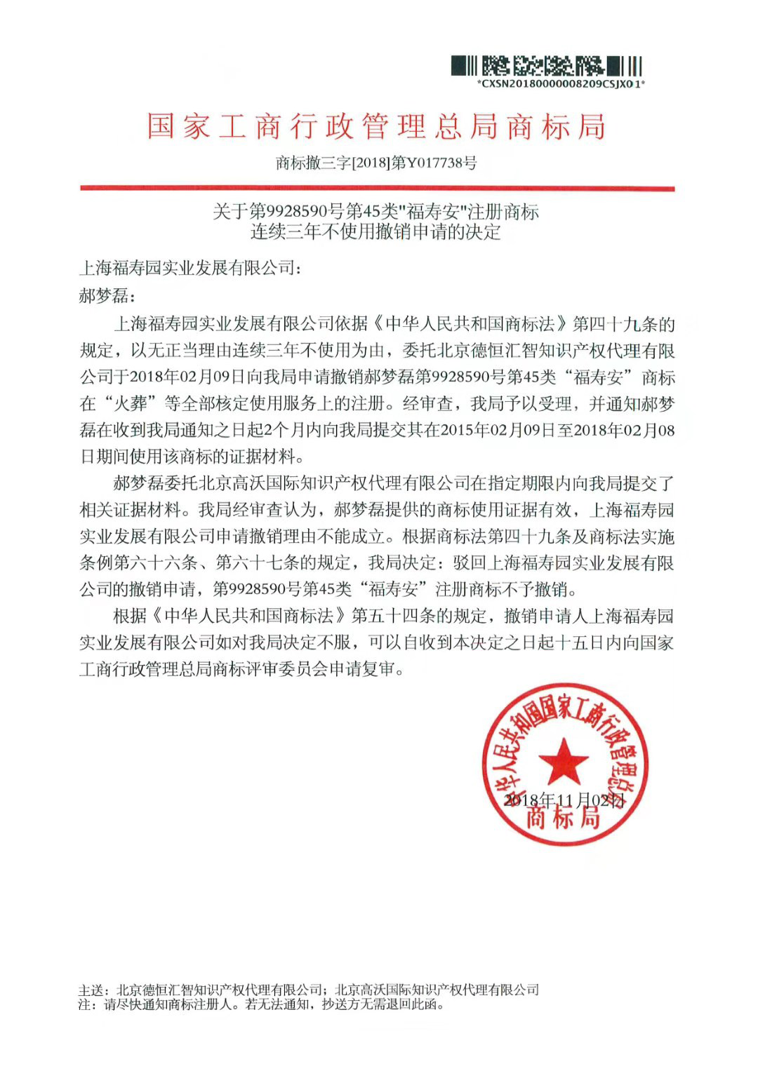 2018年2月,上海福寿园实业发展有限公司以连续三年不使用为由,向国家工商总局商标局申请撤销9928590号“福寿安”商标在第45类“火葬”等全部核定使用服务上的注册。