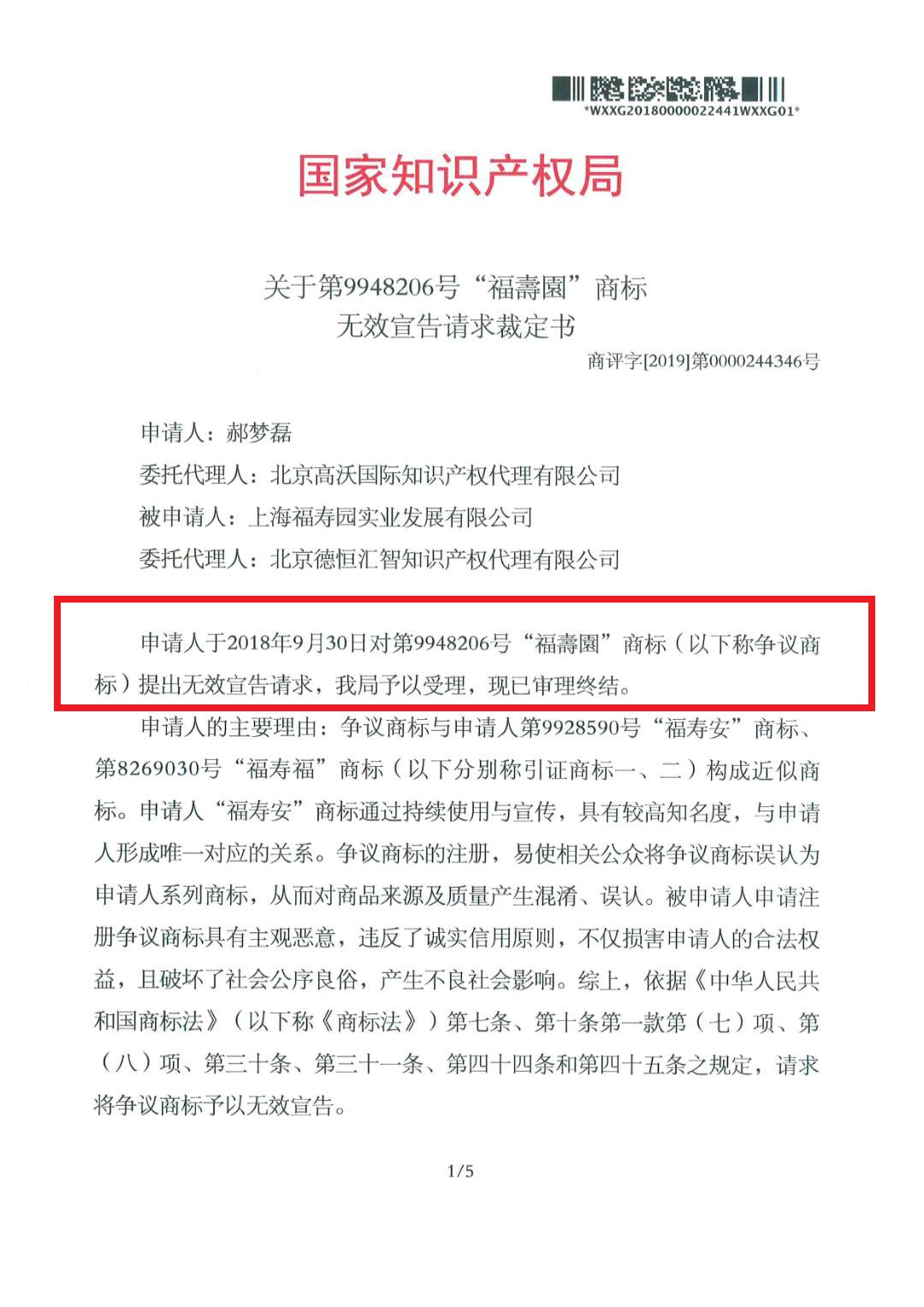 2019年10月10日,国家知识产权局依法做出裁定后,上海福寿园实业集团有限公司不服裁定,将国家知识产权局告上法庭,请求人民法院撤销被诉裁定,并责令被告重新作出裁定。