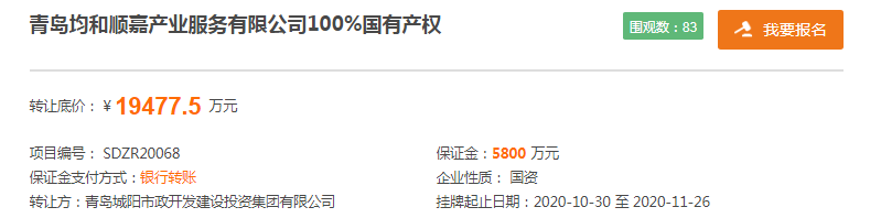 近日,青岛城阳市政开发建设投资集团有限公司发布公告称,拟以1.95亿元底价,转让青岛均和顺嘉产业服务有限公司100%股权,值得注意的是,标的企业成立时间刚满2个月。