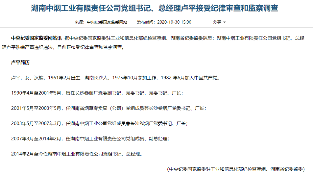 10月30日,中央纪委国家监委网站发布消息,据中央纪委国家监委驻工业和信息化部纪检监察组、湖南省纪委监委消息:湖南中烟工业有限责任公司党组书记、总经理卢平涉嫌严重违纪违法,目前正接受纪律审查和监察调查。