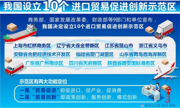 商务部外贸司司长李兴乾4日在国家会展中心(上海)接受媒体采访时介绍,10个进口贸易促进创新示范区分别是上海市虹桥商务区、辽宁省大连金普新区、江苏省昆山市、浙江省义乌市、安徽省合肥经济技术开发区、福建省厦门湖里区、山东省青岛西海岸新区、广东省广州南沙区、四川省天府新区和陕西省西安国际港务区。10个示范区覆盖东中西部和东北地区,体现中国进口发展的动力和潜能。