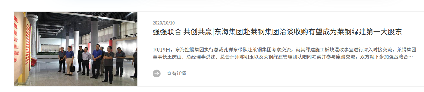 鲁网·泰山财经记者梳理发现,就在上月10日,东海集团官网发布的一则消息称,东海集团相关负责人曾赴莱钢集团考察交流,就其绿建施工板块混改事宜进行深入对接交流,“双方就下步加强战略合作、推进混改工作等事项达成深度共识,东海集团有望成为莱钢绿建第一大股东。”