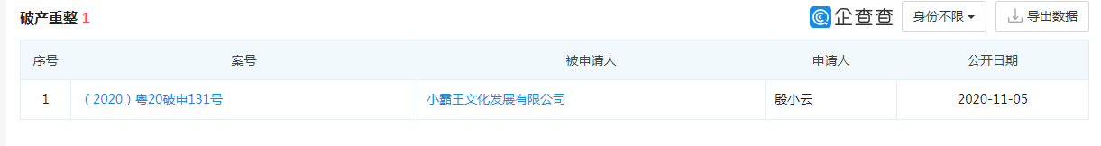 据企查查资料显示,近日,小霸王文化被申请破产重整,申请人为殷小云,案号为(2020)粤20破申131号。鲁网·泰山财经记者获悉,小霸王文化法定代表人冯宝伦已被中山市第一人民法院列为限制高消费人员,不得在星级以上宾馆、酒店、夜总会、高尔夫球场等场所进行高消费,不得购买不动产或者新建、扩建、高档装修房屋等。