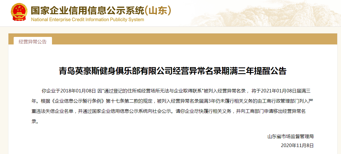 据公告显示,2018年1月8日,英豪斯健身因"通过登记的住所或经营场所无法与企业取得联系"被列入经营异常名录,2021年1月8日将满三年。根据《企业信息公示暂行条例》第十七条第二款的规定,被列入经营异常名录届满3年仍未履行相关义务的企业,将由工商行政管理部门列入严重违法失信企业名单,并通过国家企业信用信息公示系统向社会公示。省市监局称,英豪斯健身应尽快履行相关义务,并向工商部门申请移出经营异常名录。