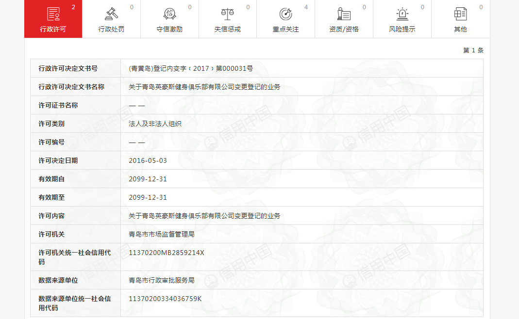 鲁网·泰山财经记者在国家企业信用信息公示系统中看到,英豪斯健身仍显示为在营(开业)状态,针对此事,鲁网·泰山财经记者联系了青市监局宣传科工作人员,但截至发稿时,并未得到相关回复。另据信用中国系统显示,英豪斯健身行政许可于2099年12月31日到期,许可单位为青市监局。