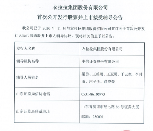 近日,鲁网·泰山财经记者自山东监管局获悉,衣拉拉集团股份有限公司(以下简称“衣拉拉”)已同中信证券签署上市辅导协议,并于近日在山东证监局备案。