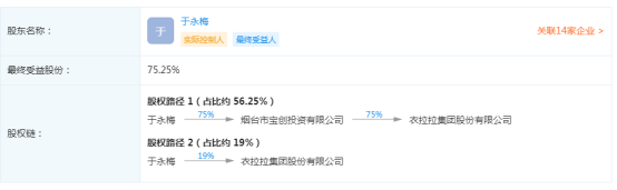 据企查查显示,衣拉拉有三大股东,烟台市宝创投资有限公司(下称“宝创投资”)持股75%位列第一;董事长于永梅和范卫红分别持股19%和6%,分列二三位。值得一提的是,于永梅通过持有宝创投资75%股权进一步持有衣拉拉股权,最终受益股份75.25%,为衣拉拉实际控制人。