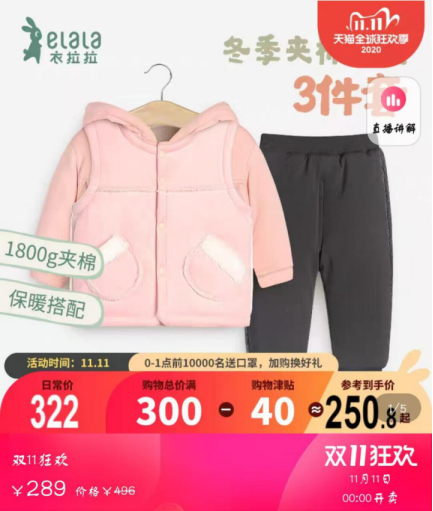 据悉,衣拉拉价格本身走亲民路线,鲁网·泰山财经记者浏览其线上店铺发现,几乎所有单件的服装都在百元以内;所有商品浏览下来,最贵的是一个含有加厚夹棉上衣、马甲和裤子的0-1岁女童的三件套,价格为322元,叠加淘宝双十一活动后到手价约为250.8元。