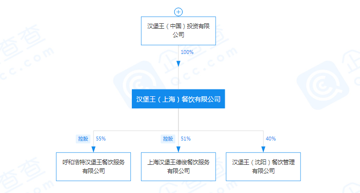企查查信息显示,汉堡王(上海)餐饮有限公司成立于2005年,注册资本7690万美元,法定代表人为吕爱军。该公司由汉堡王(中国)投资有限公司汉堡王(中国)投资有限公司全资控股。经营范围包括餐饮服务;食品销售;带汉堡王品牌标志的纪念品、玩具、工艺品(文物除外)、文具的配套零售和进出口,并提供相关的餐饮管理咨询服务等。