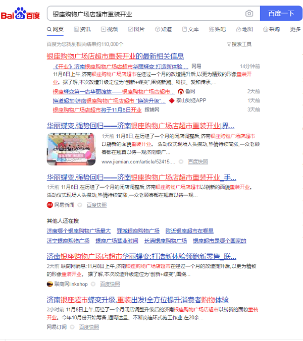 11月11日8:49在百度搜索框中输入“银座购物广场店超市重装开业”,会找到相关结果约11万条,发布信息的媒体既有山东卫视、齐鲁晚报、山东商报、鲁网·泰山财经、齐鲁网·闪电新闻、大众网·海报新闻、界面新闻等省内主流媒体,也有联商网等专业的零售业媒体,既有业内主流机构的自媒体账号,也有重点媒体的新媒体平台,“济南银座购物广场店超市重装开业”成为媒体和社会大众关注的焦点,同时,济南银座购物广场店超市 “换装升级”成传播热点。