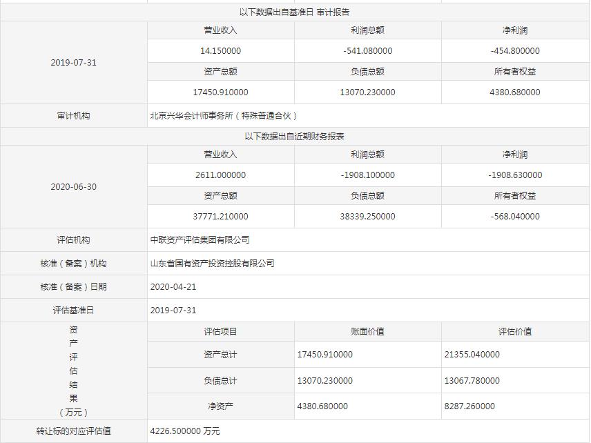 另据中联资产评估集团有限公司评估,标的企业资产总结2.14亿元,负债总计1.31万元,净资产8287.26万元,推算转让评估值为4226.50万元。