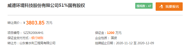 12日,山东省水利工程局有限公司发布公告称,拟以3803.85万元的底价,转让旗下威德环境科技股份有限公司(简称“威德环境”)51%股权,转让时间为11月12日至12月9日。据全国中小企业股份转让系统显示,威德环境是该系统下的挂牌企业。