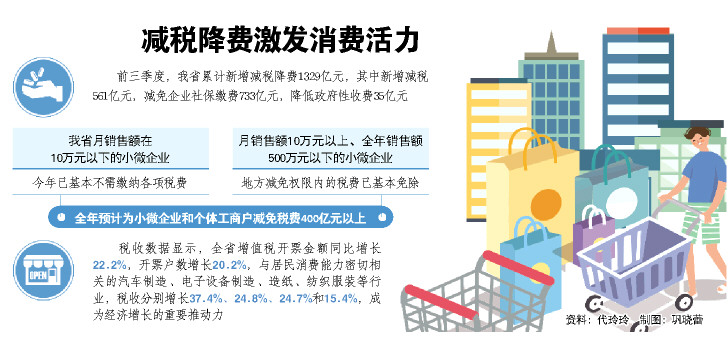 经测算,前三季度,我省累计新增减税降费1329亿元,其中新增减税561亿元,减免企业社保缴费733亿元,降低政府性收费35亿元。相关数据表明,包括减税降费在内的一系列政策效应正加速释放,各产业领域加速向好,消费市场加速回暖,各类市场主体活力稳步恢复。