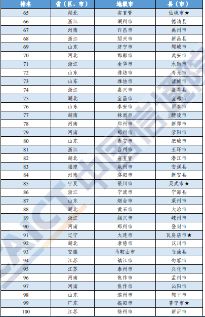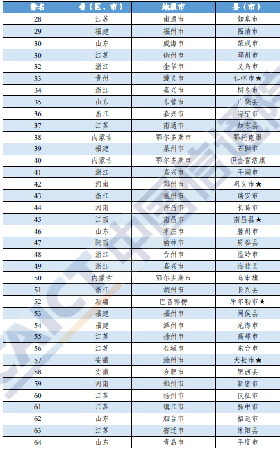 山东上榜14个县(市)分别为:龙口市、胶州市、荣成市、广饶县、滕州市、招远市、平度市、邹城市、寿光市、诸城市、新泰市、肥城市、莱州市、邹平市。与去年相比减少4个县(市)。
