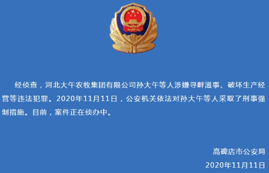 11月11日,高碑店市公安局发布警情通报:经侦查,河北大午农牧集团有限公司孙大午等人涉嫌寻衅滋事、破坏生产经营等违法犯罪。2020年11月11日,公安机关依法对孙大午等人采取了刑事强制措施。目前,案件正在侦办中。